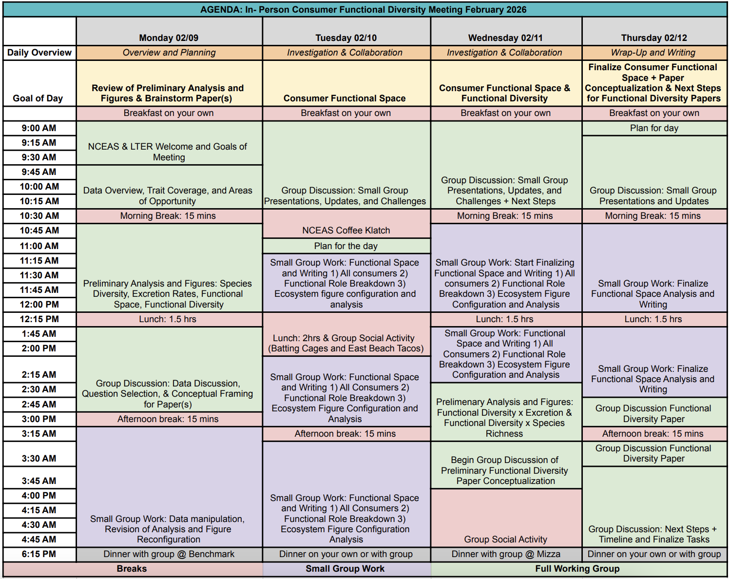The working group will convene at the National Center for Ecological Analysis and Synthesis (NCEAS) the week of February 9-13, 2026. Our meetings will begin each morning at 9 AM and end at 5 PM. Feel free to bring your own snacks to enjoy during meeting breaks throughout the week. NCEAS will be providing plenty of coffee for us! For those joining remotely, find zoom link here